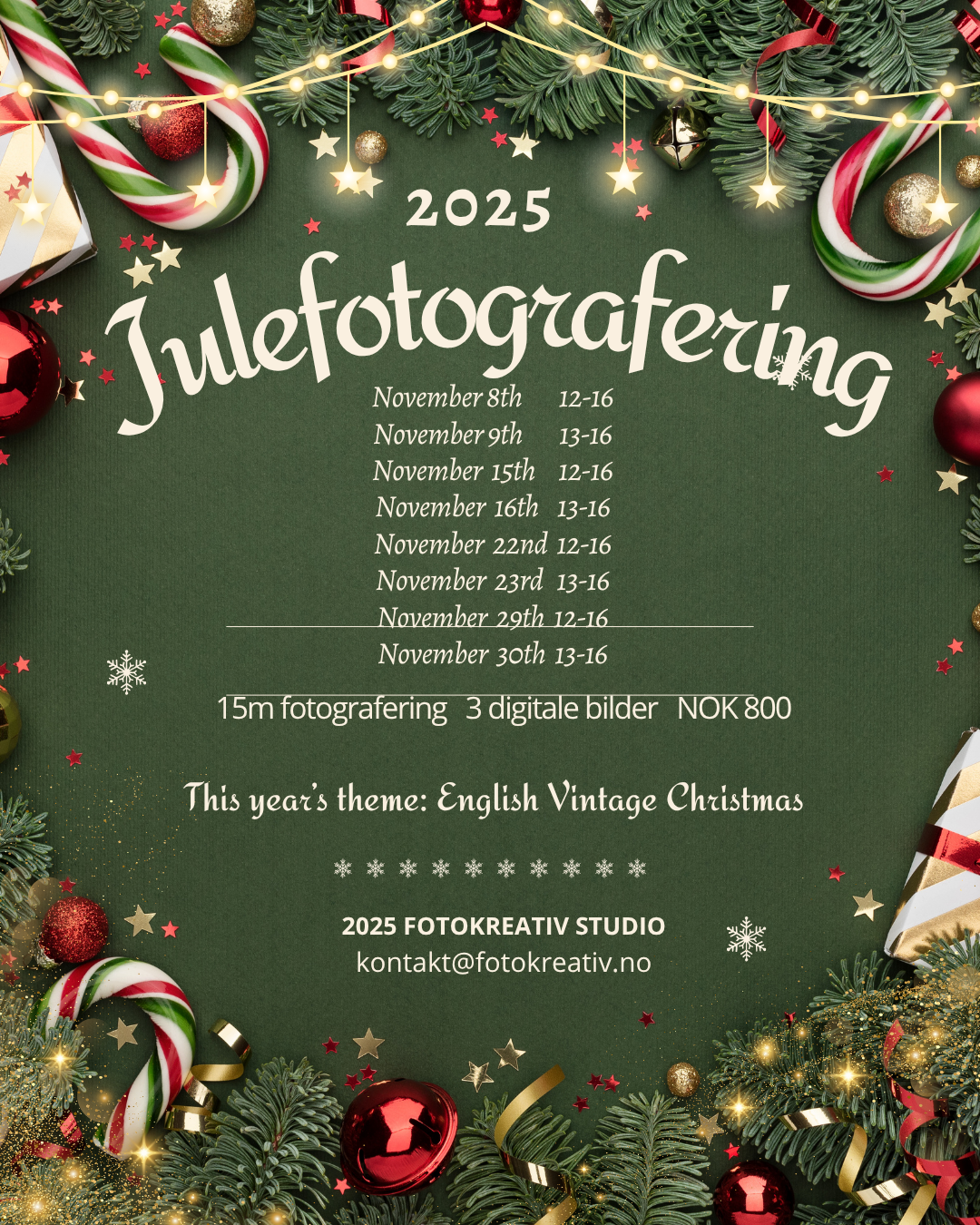 Aktuelle minisessioner annonseres på min Facebook og på nettsiden. Julekortfotografering holdes nesten hele november.